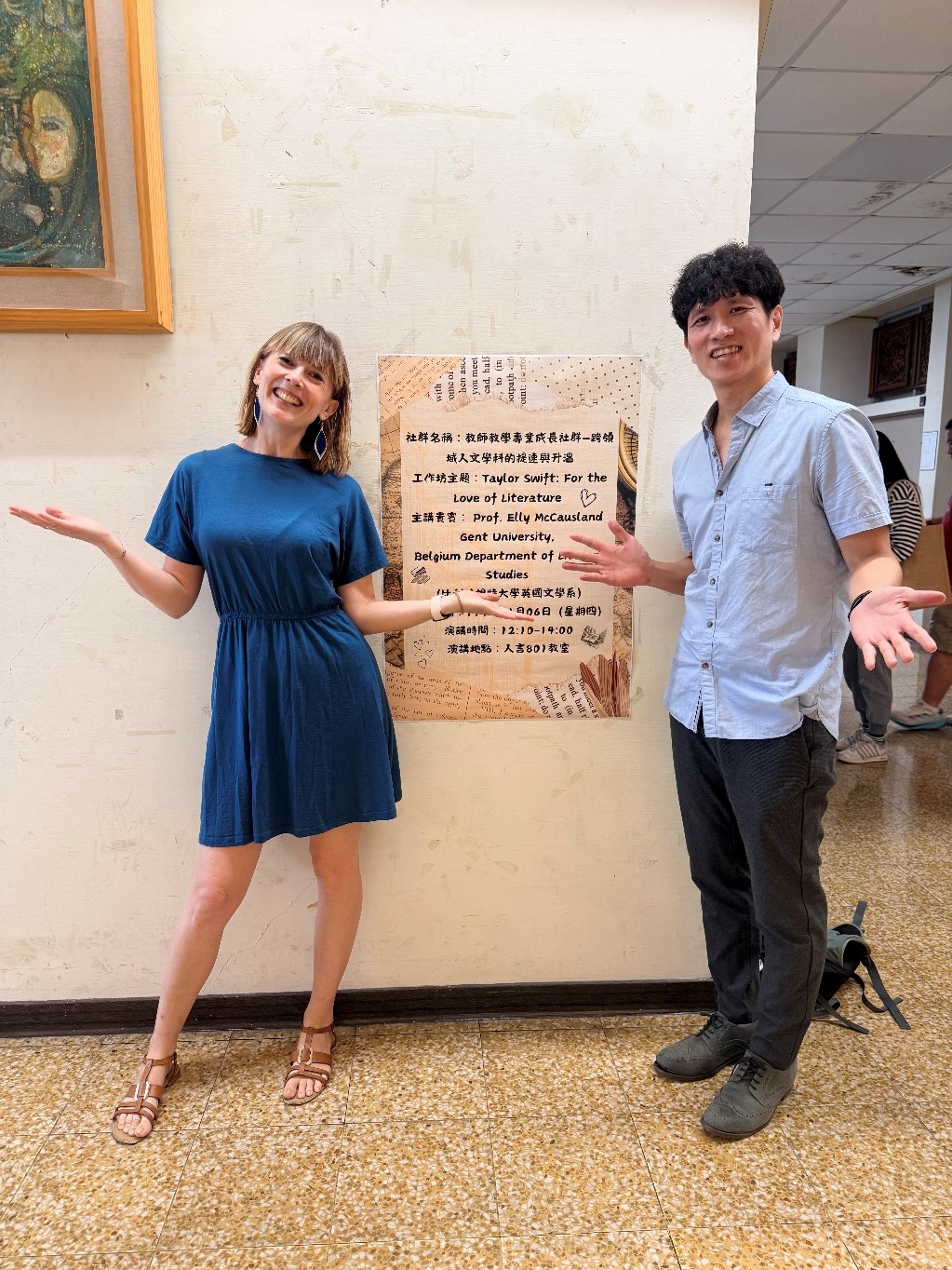 圖為本次工作坊主講者與活動主持人在會場前合影。兩位講者站在「Taylor Swift: For the Love of Literature」主題海報旁,以愉悅的姿態展示活動資訊,展現輕鬆且富創意的跨領域學術交流氛圍。